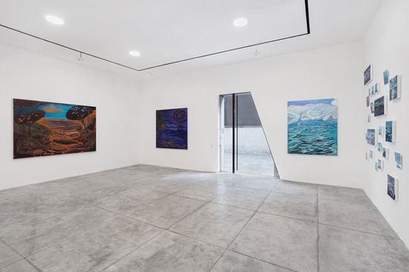 A água doce também aparece em outra tela de larga escala exposta na galeria, Sobre todas as cores (2023). Nela, o brilho da lua reflete em um rio silencioso, quase soturno, reforçando a profunda e misteriosa relação que a artista percebe do elemento com o corpo feminino, ambos capazes de criar e recriar vida. Já em Noturno (2023) e na série Antárticos (2024), o ciclo se volta ao mar. Com uma composição semelhante à do líquido amniótico humano, o oceano é reduto de vida e transformação e simboliza nas pinturas de Esther também o renascimento e a organicidade. Afinal, nascer também é a prova de que somos nada além da metamorfose, de uma pequena modificação de uma parte ínfima da carne do mundo. A partir desse eterno retorno, a circularidade de começos, meios e recomeços endossa o pensamento que não existe fim.